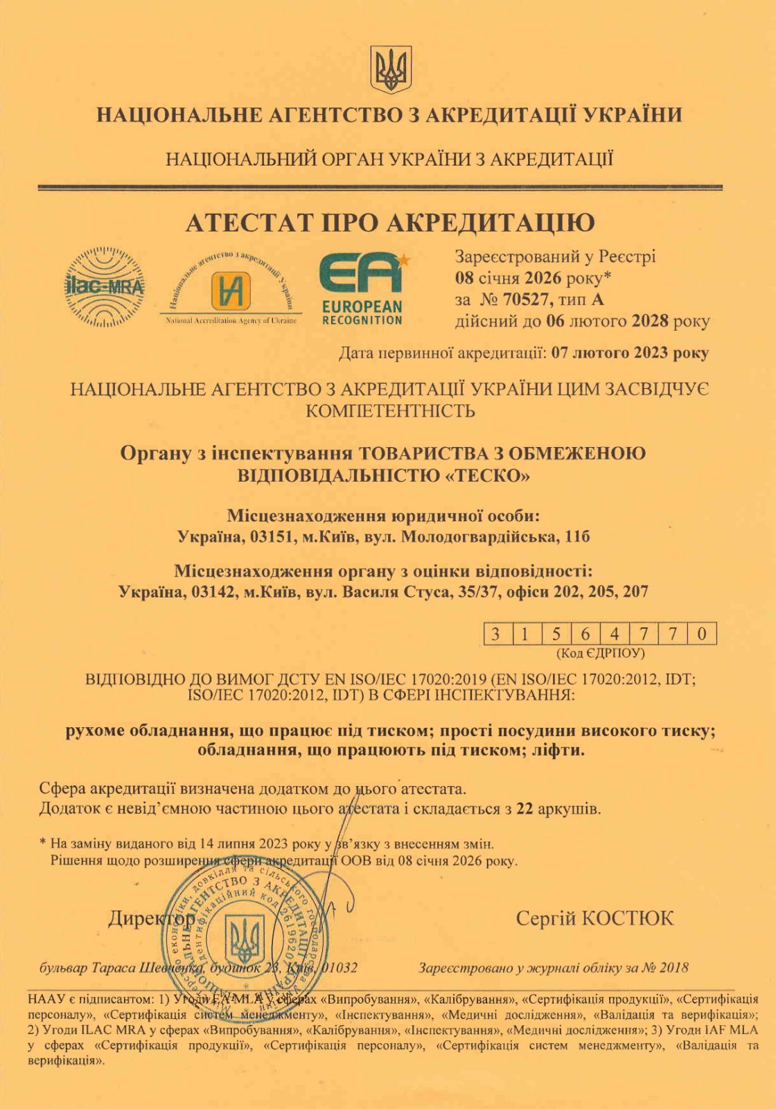 TECKO LTD. is accredited by the National Accreditation Agency of Ukraine (NAAU) for compliance with the requirements of the standards DSTU EN ISO/IEC 17065, DSTU EN ISO/IEC 17021-1, DSTU EN ISO/IEC 17020. Testing laboratory "TECKO" is accredited for compliance with the standard DSTU EN ISO/IEC 17025 and is also focused on testing in the field of technical regulations of our Conformity Assessment Body.